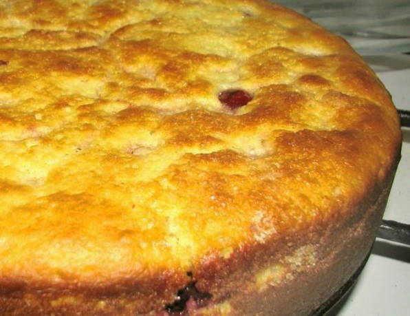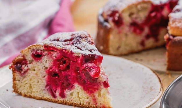 Blozende zanddeegcake met kersen is klaar. Snijd het in stukken en serveer!