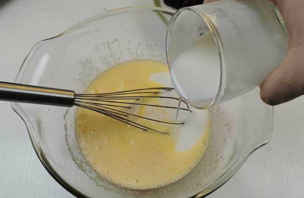 - Om te gieten, combineer eieren met zure room, suiker en zetmeel.