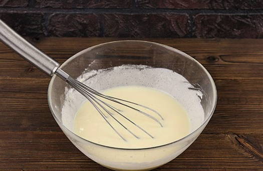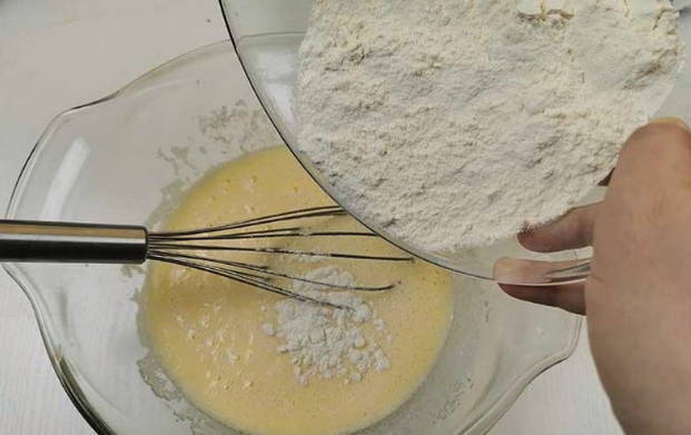 - Roer bloem met bakpoeder. We zeven de massa tot een vloeibare samenstelling.