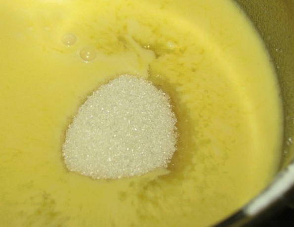 - We breken kippeneieren in een diep bord. Die vullen we aan met suiker en zout.