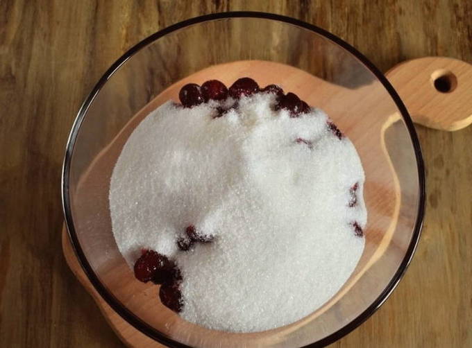- Giet de voorbereide kersen met suiker en laat ze 15 minuten staan.