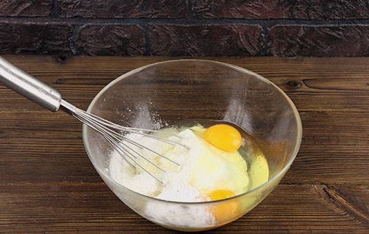 - Klop het eiermengsel totdat de droge ingrediënten zijn opgelost.