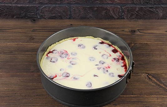 - Verdeel de wrongelblanco gelijkmatig over de bessenlaag. We bakken het dessert 1 uur op 180 graden.