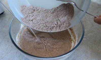 - Bloem zeven met bakpoeder. Voeg hier de benodigde hoeveelheid cacao toe.
