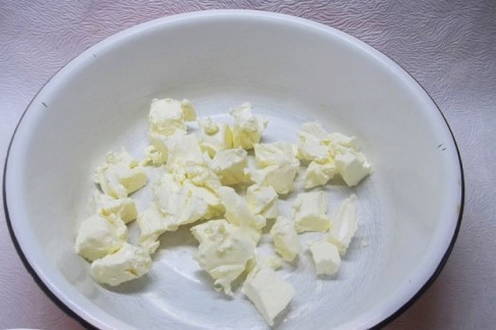 - Verdeel de zachte boter in kleine stukjes. We sturen ze naar een diepe kom.