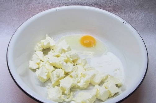 - Klop het ei met zout en suiker en combineer het product met zachte boter. Kneed met een vork tot een gladde massa.