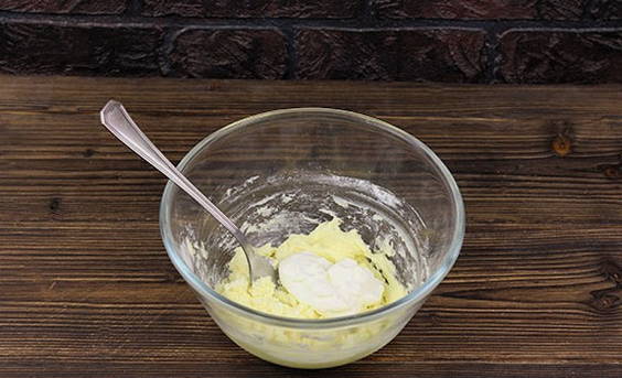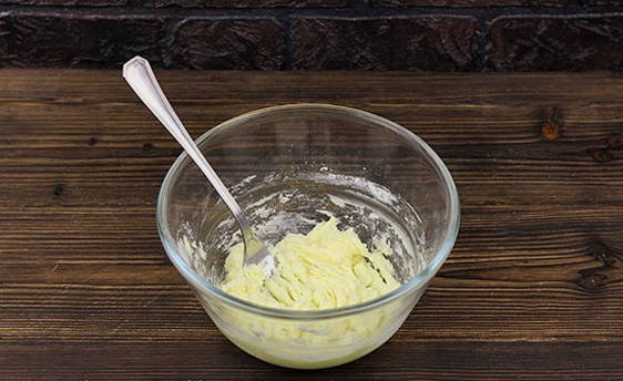- Klop het ei met zout en suiker en combineer het product met zachte boter. Kneed met een vork tot een gladde massa.