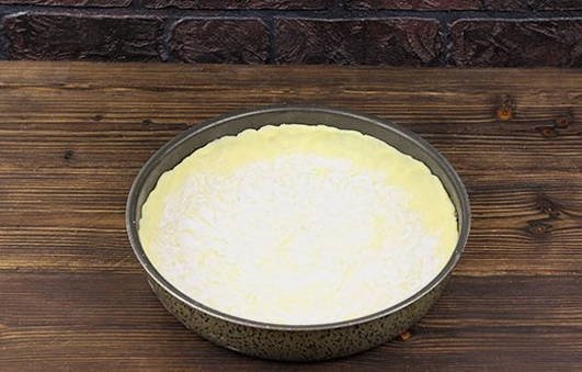 - Verdeel het afgewerkte deeg over de bodem van de hittebestendige vorm.