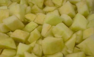 - We wassen de appels, schillen en snijden de klokhuizen eruit. Ongeschild fruit zal te duidelijk aanvoelen in de afgewerkte schaal. En als je het fruit schilt, is het gemakkelijker om een homogene en delicate consistentie toe te voegen, die qua smaak bijna niet verschilt van het deeg zelf. Snijd de appels in kleine stukjes.