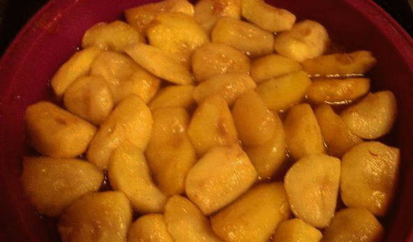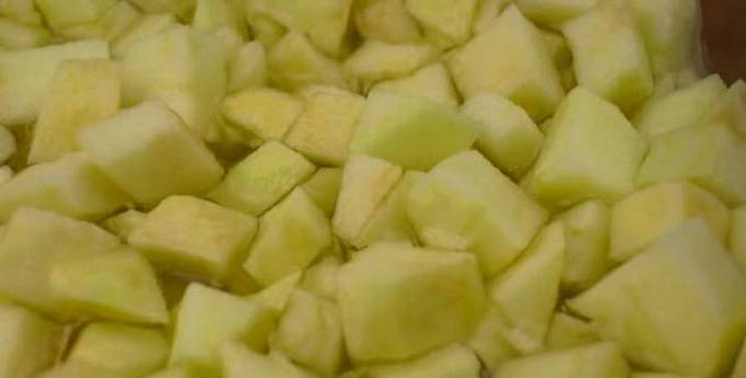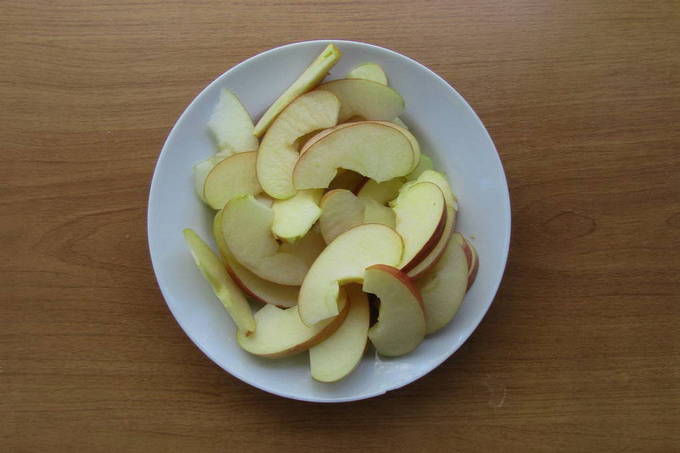 - Mix alles tot een glad geheel. We wassen de appels, schillen ze, verwijderen het klokhuis en snijden ze in gelijke delen. Voeg een klein stukje boter toe aan de appels en stuur ze 3 minuten. in de magnetron. Dit geeft ze zachtheid.