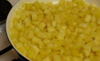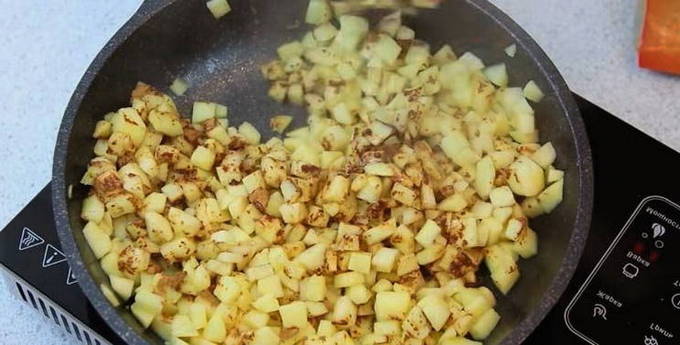 - Laten we voor de vulling zorgen. Schil de appels en snijd ze in kleine stukjes. Smelt de boter in een koekenpan en leg de gesneden appels erop. Laat ze ongeveer 3-5 minuten sudderen, af en toe roeren om ze zachter te maken. Voeg aan het einde van het stoven kaneel toe en roer opnieuw. Haal vervolgens van het vuur en wacht tot het is afgekoeld tot kamertemperatuur.