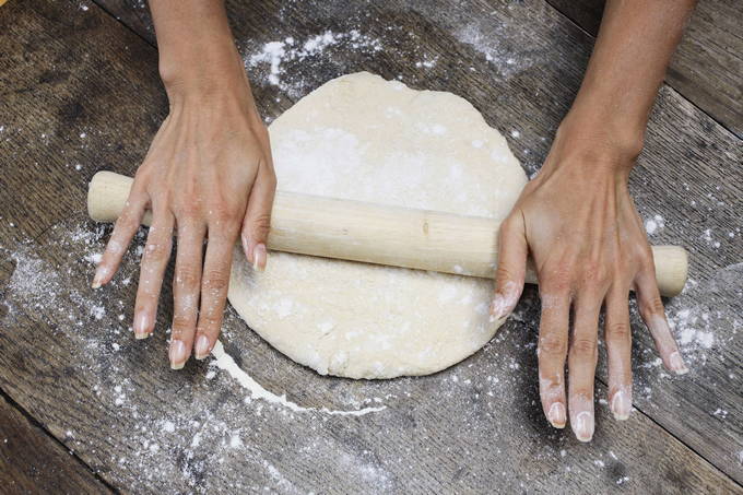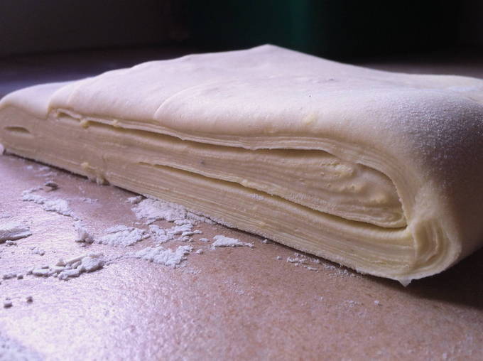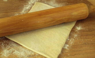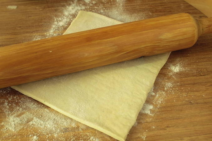 Ontdooi bladerdeeg zonder gist en rol uit op een tafel bestrooid met bloem zodat het deeg niet plakt.