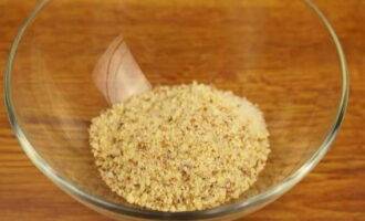 Bereid de topping in een apart bakje. We kneden kaneel met suiker en gemalen amandelen: het geeft niet alleen een pittige smaak, maar neemt ook het overtollige vocht op dat in de appelvulling bewaard is gebleven.