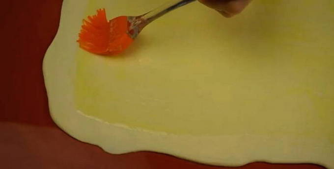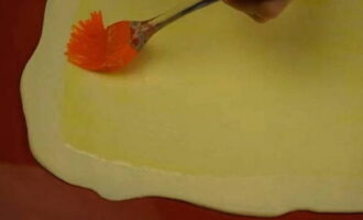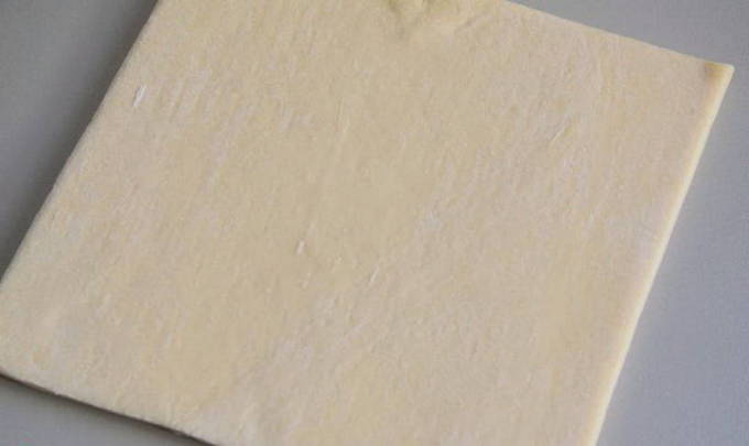- Ontdooi het bladerdeeg voor en verdeel het in twee delen: een van de delen moet een derde groter zijn dan de andere. Rol een groter stuk uit met een deegroller, zodat het even groot is als een bakplaat, of zelfs iets over de randen uitsteekt. Smeer het platform in met olie en leg de opgerolde rechthoek erin.