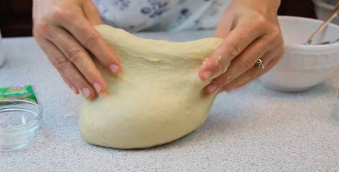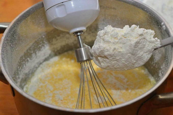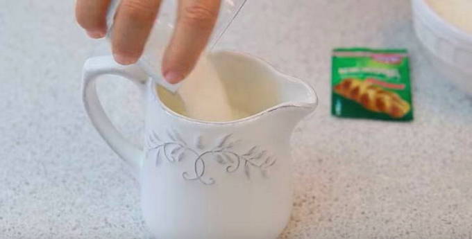 - We verwarmen de melk en lossen het zout en de suiker erin op. Smelt de boter. Passeer de bloem door een zeef en voeg de droge gist direct aan de bloem toe. Meng heel goed zodat de gist niet op één plek blijft zitten. We maken een klein gaatje in de bloem en gieten melk met zout en suiker, boter die we hebben gesmolten, en rijden in een ei.