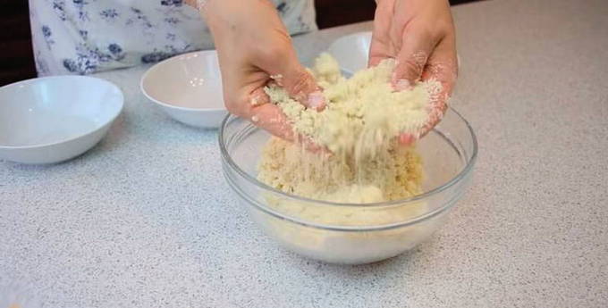 - Kruimel hagelslag koken. Meng bloem en suiker, voeg fijngehakte gekoelde boter toe en wrijf deze ingrediënten snel met je handen tot een kruimeltje ter grootte van een erwt.