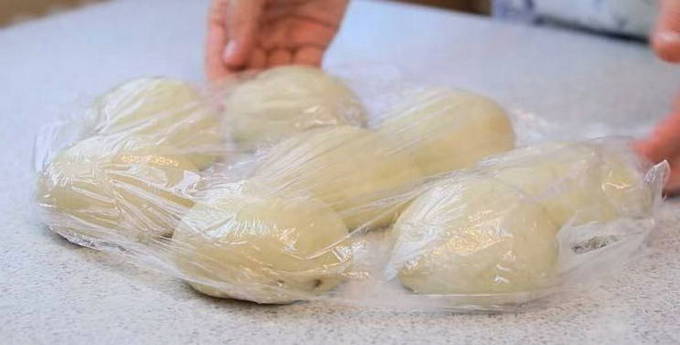 - Rol het homogene deeg tot een bal en leg het in een kom die vooraf is ingevet met plantaardige olie. Dek af met huishoudfolie en laat een uur staan. Gedurende deze tijd zal het deeg rijzen en zal het meerdere keren merkbaar in volume toenemen.