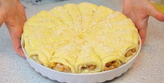 - Vet een ovenschaal in met boter en bestrooi met bloem, leg de bagels daar met het scherpe uiteinde in het midden tot een taart bestaande uit driehoeken. Laat de cake 30-40 minuten staan.