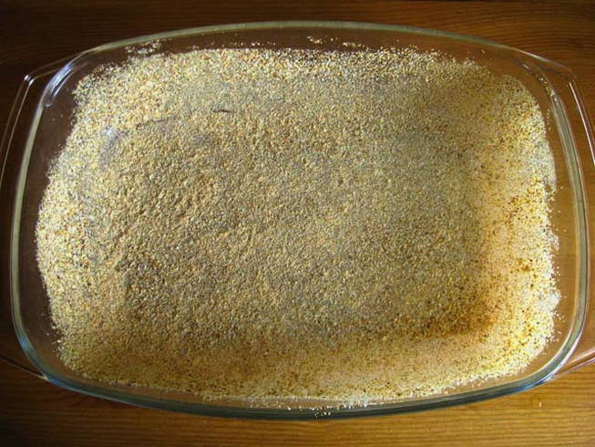 - Bestrooi de bodem met gemalen broodkruim. Hierdoor wordt het werkstuk niet nat van het vocht dat tijdens het kookproces uit de appels komt.