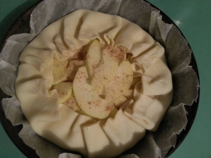 - Leg het deeg op een bakplaat en verdeel de appelvulling gelijkmatig over de hele vorm. We maken zijkanten van de randen van het deeg zodat de vulling niet gaat vloeien tijdens het bakproces.