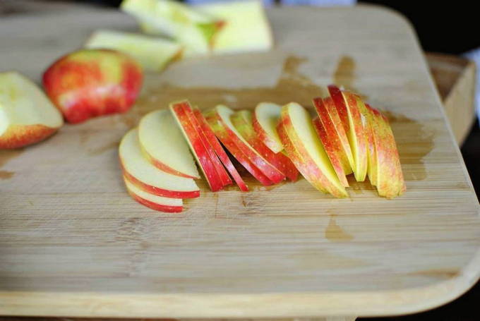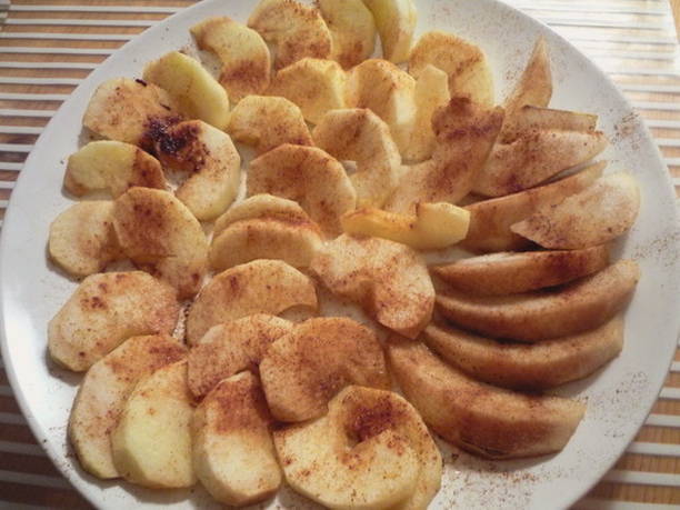 - Was de appels, schil ze, ontpit ze en snijd ze in dunne plakjes. Bestrooi deze plakjes met kaneel en roer.