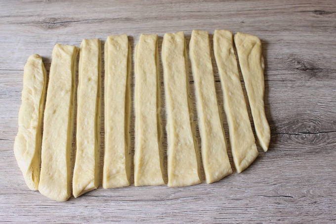 - Rol het deeg uit in een laag van een halve centimeter hoog: dan snijden we er reepjes van ongeveer 8 cm vanaf.