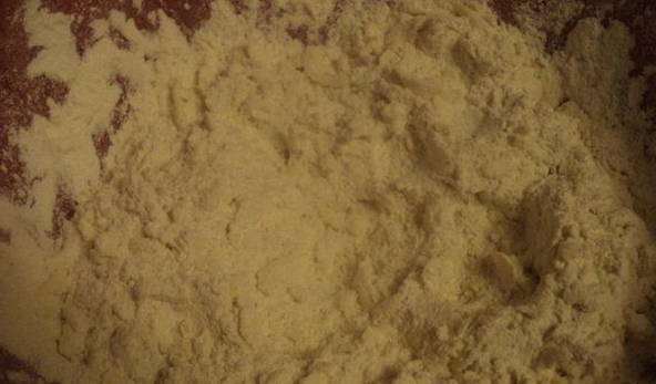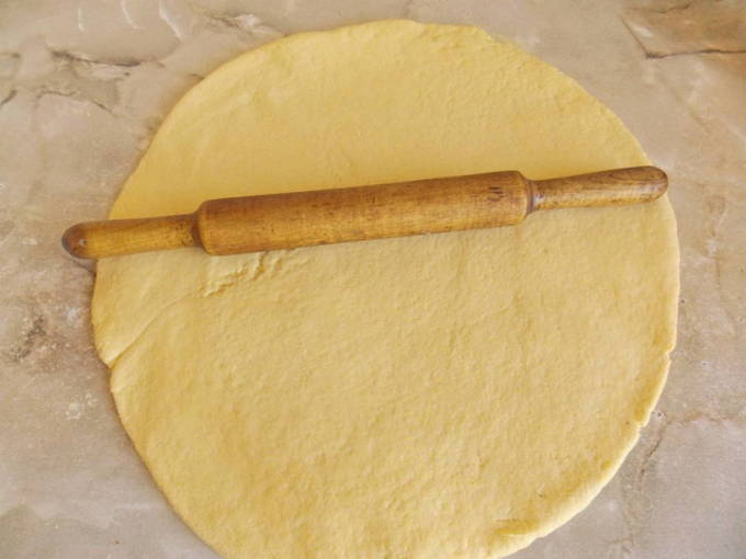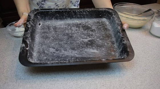- Verwarm de oven voor op 180 graden. Neem een bakplaat en bestrooi deze met bloem zodat deze de hele vorm in een dunne laag vult. In dit geval kun je het gebruik van olie weigeren, omdat het deeg dan al behoorlijk vet is en door de bloem niet aan de ovenschaal blijft plakken.