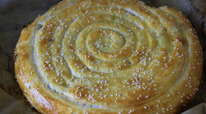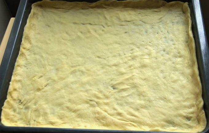 - Klop het eigeel los met een vork en vet de taart ermee in. Als je wilt, kun je bestrooien met sesamzaad, maanzaad, colaspaanders, enz. We zetten een bakplaat met een taart 30 minuten in de oven. Het is al opgewarmd tot 180 graden. De taart is snel klaar. Laat het iets afkoelen, en dan kun je serveren voor een monster. Het is noodzakelijk om de taart af te koelen voordat u hem aansnijdt, zodat de bovenste goudbruine korst zacht wordt. Eet smakelijk!