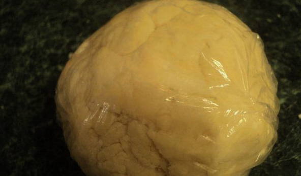 - Giet er eerst 2 eetlepels in. water en begin met het kneden van het deeg. Als je ziet dat er niet genoeg water is, voeg dan dezelfde hoeveelheid toe en kneed opnieuw. Hierdoor moet het deeg zacht, flexibel, elastisch en niet plakkerig aan je handen worden. Het is niet nodig om lang te kneden, anders smelt de boter uit warme handen en zal de bloem het deeg "hameren". Wikkel de resulterende deegbal in plasticfolie en leg in de koelkast.
