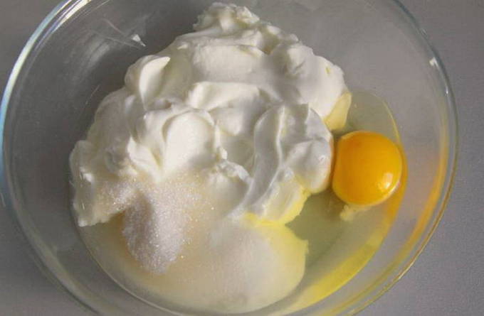 - Combineer zure room en kwark in een container, rijd daar een ei in en voeg suiker toe. U kunt het bedrag zelf aanpassen. Als je korrelige kwark hebt genomen, kan het geen kwaad om het door een zeef te halen of een blender te gebruiken om de kwark een beetje te malen. Grove korrels voelen misschien niet erg prettig aan in de afgewerkte schaal.