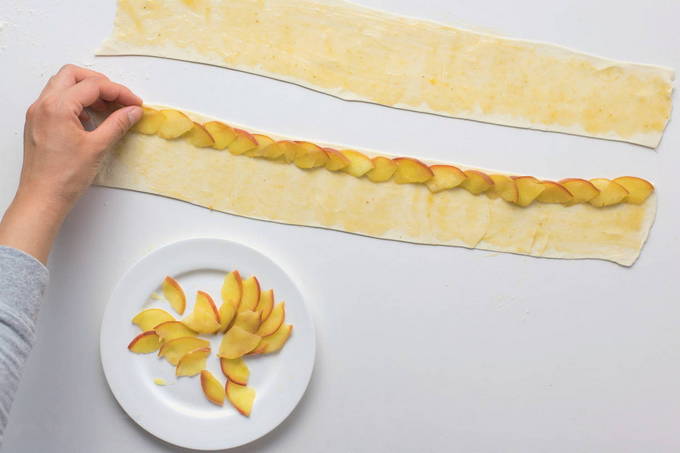 - Snijd de tweede laag bladerdeeg diagonaal in reepjes. Ten slotte leggen ze ze in een rooster en bedekken ze de vulling ermee. Giet alles erop met de appelstroop die we in het begin hebben gemaakt.