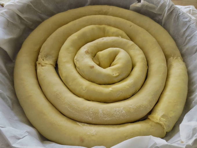 - Bedek de bakplaat met bakpapier en plaats een koker met vulling in het midden. We draaien hem om zijn as: als een slak. Dan nemen we de volgende buis en blijven draaien. Dit zal een grote spiraalvormige cake maken.