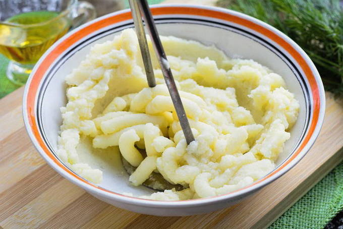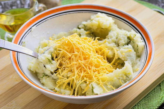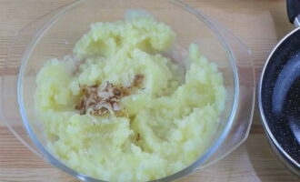 - Kook de aardappelen en snijd ze in aardappelpuree, voeg boter en een kleine hoeveelheid melk toe. We mengen aardappelpuree met champignons.
