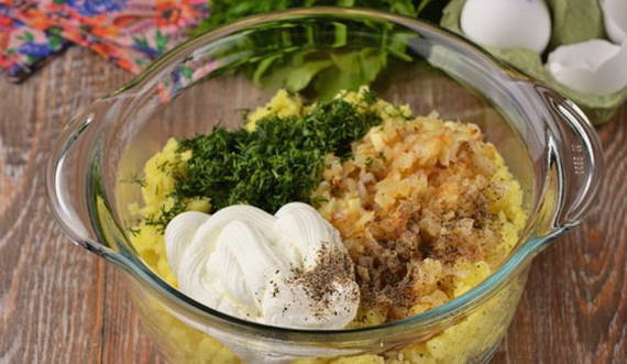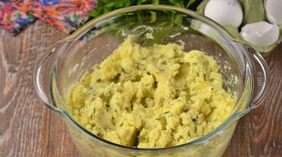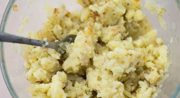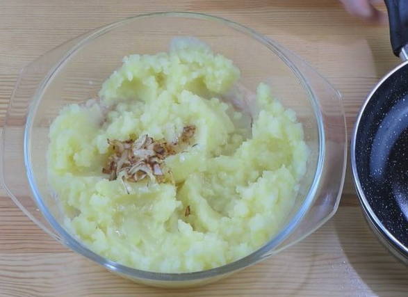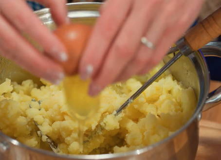- Maal de aardappelpuree en voeg het ei eraan toe.