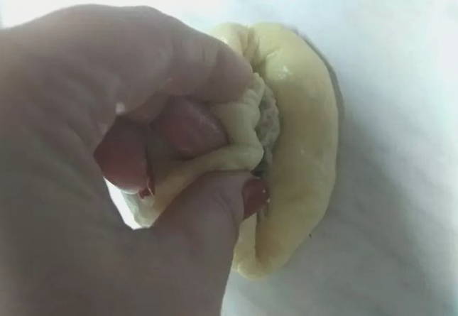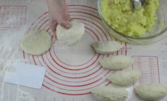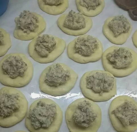 - Verdeel het deeg in stukken, rol er balletjes van en kneed ze tot een cake. We verspreiden de vulling in het midden van elke cake.