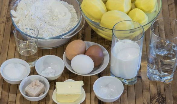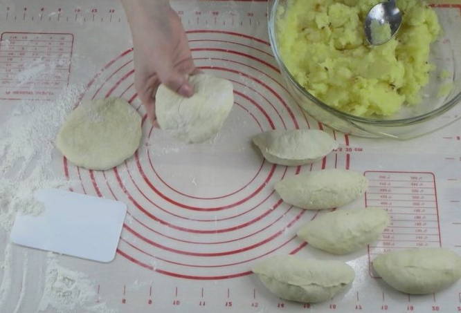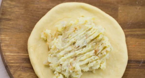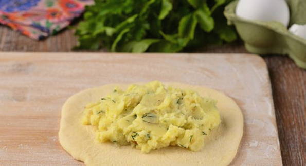 Kook voor de vulling de aardappelen in gezouten water. Snipper de ui en bak in plantaardige olie tot ze zacht zijn. Kneed de aardappelen, voeg de ui toe en meng goed.