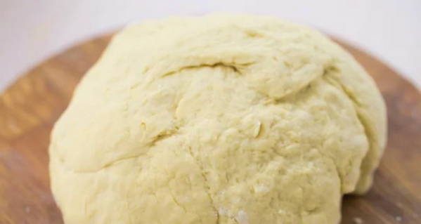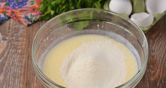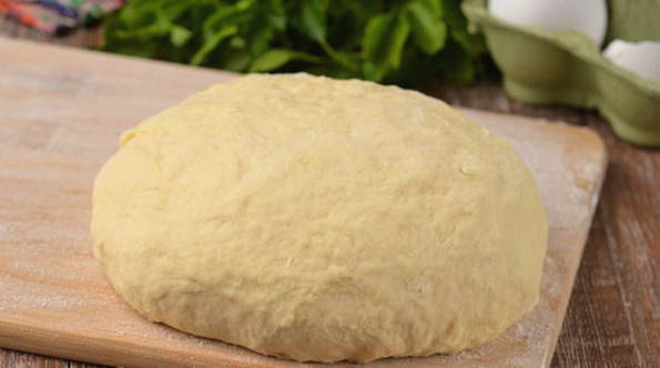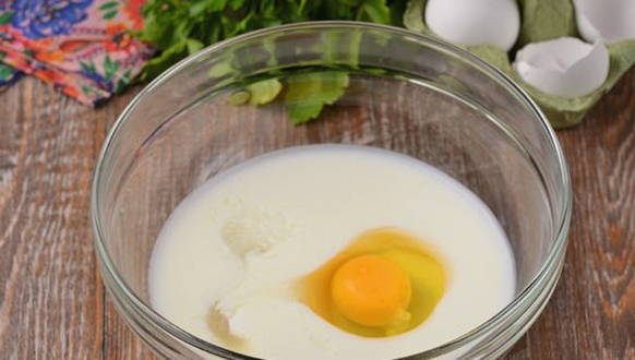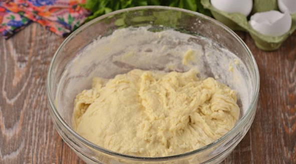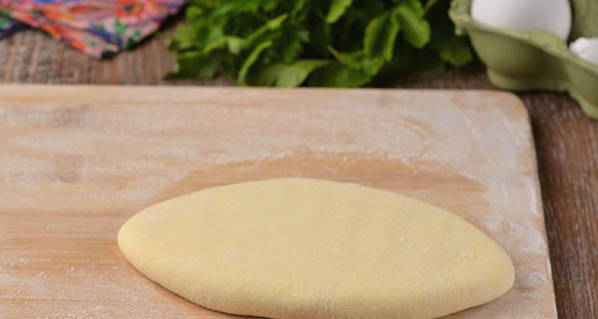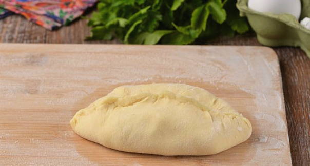 - Allereerst bereiden we het deeg voor. Meng hiervoor het ei met kefir en giet geleidelijk bloem in een kom, waarna we het deeg kneden, soda, olie en zout toevoegen. Kneed het deeg tot het niet meer plakkerig is en rol het tot een bal.
