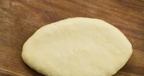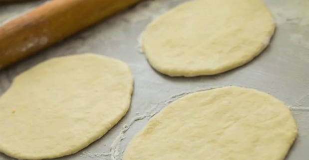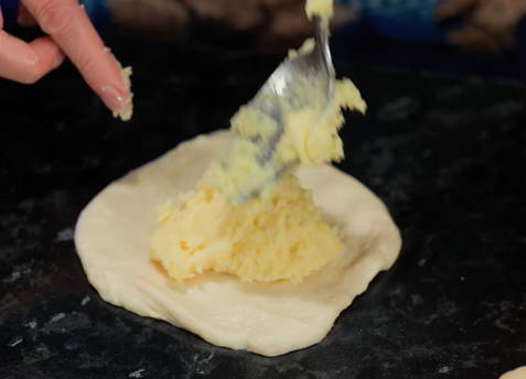 Verdeel het deeg dat ontstaat in gelijke stukken en rol er balletjes van, die we daarna tot platte cakes kneden. We leggen de vulling in het midden van elk en verbinden de randen.