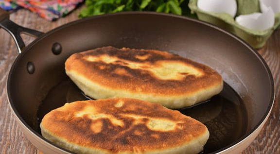 Een eenvoudig recept voor heerlijke taarten in een pan. Het deeg blijkt mals en luchtig te zijn, en de aardappel-ui-vulling is verschrikkelijk smakelijk. Door het bakken in een pan wordt het proces van het maken van taarten aanzienlijk versneld.