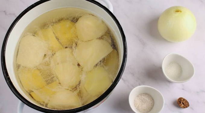 - Laten we op dit moment beginnen met het voorbereiden van de vulling. Schil en kook de aardappelen.