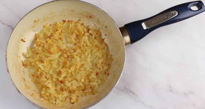 - Schil en snij de ui in kleine blokjes en bak ze met een halve theelepel suiker goudbruin.