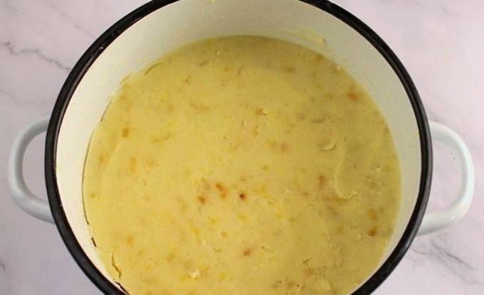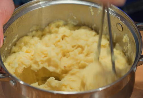 - Voeg melk toe aan de afgewerkte aardappelen en maal ze in aardappelpuree.