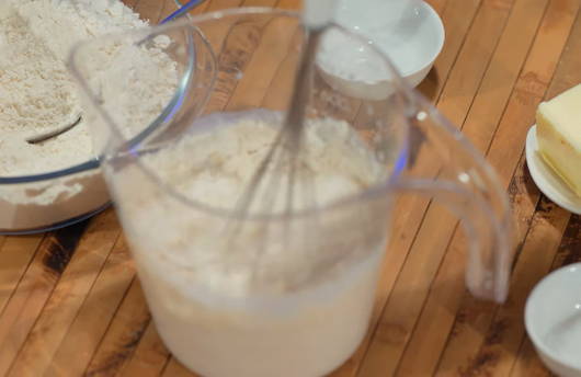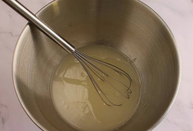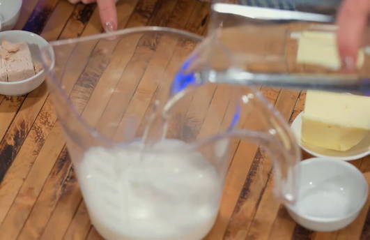 - Laten we beginnen met het maken van het deeg. Meng eerst warme melk met warm water.