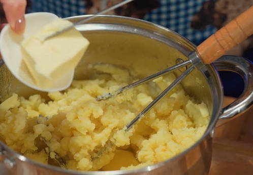 - Kook de aardappelen gaar, kneed ze tot puree en voeg zout en peper toe.