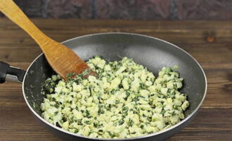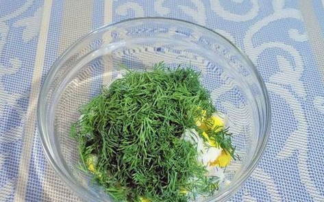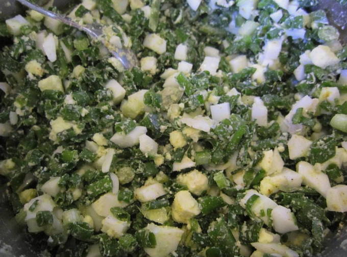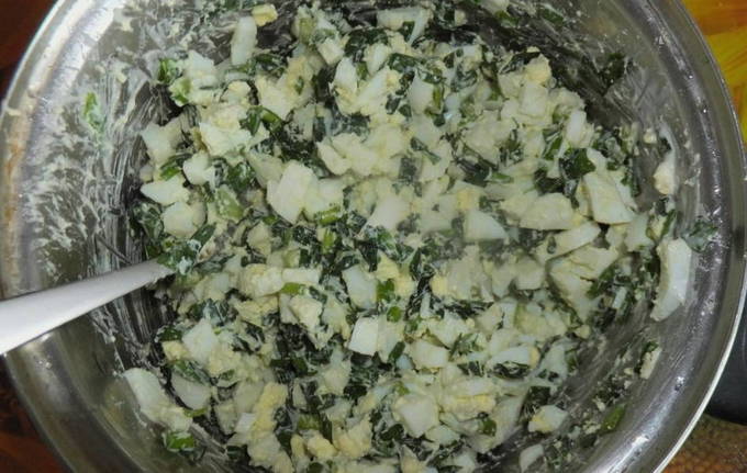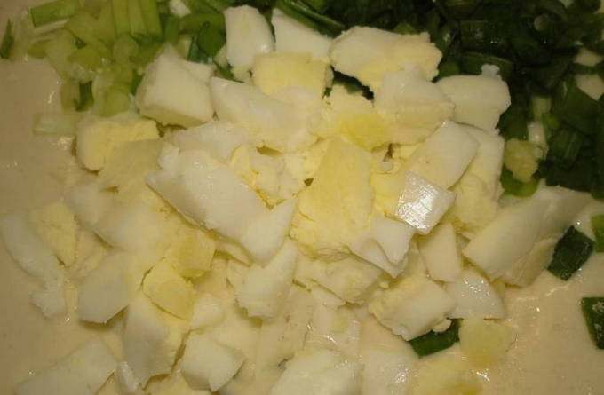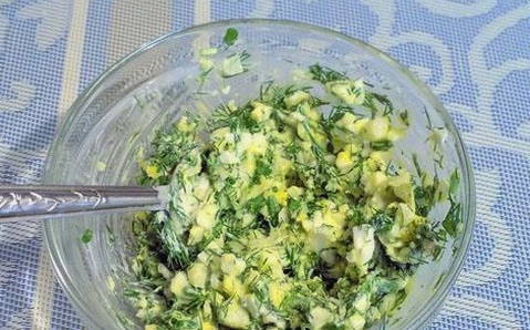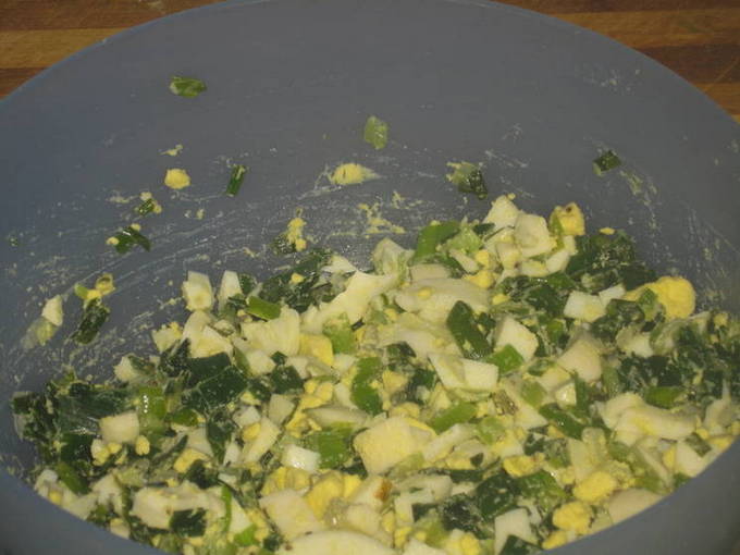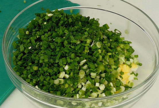 - Maal voor de vulling gekookte eieren, groene uien en geraspte kaas. Roer de producten tot ze gelijkmatig verdeeld zijn.