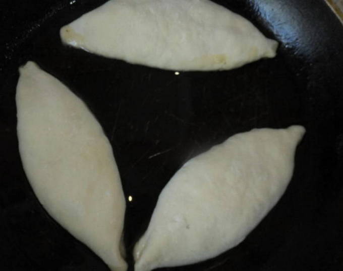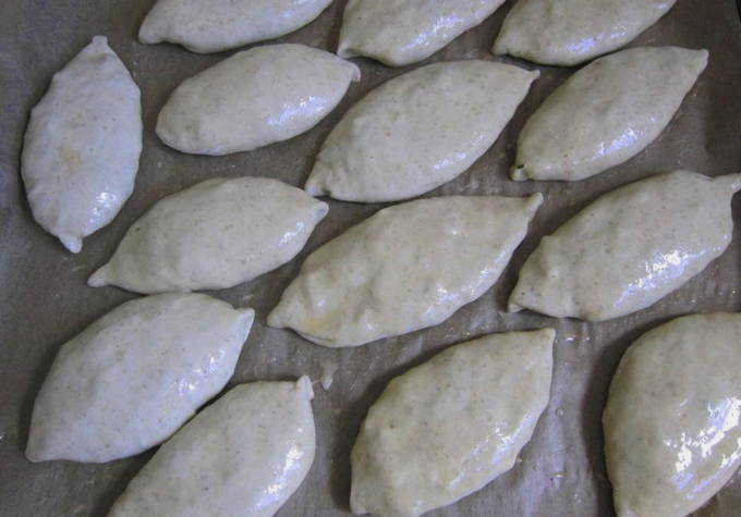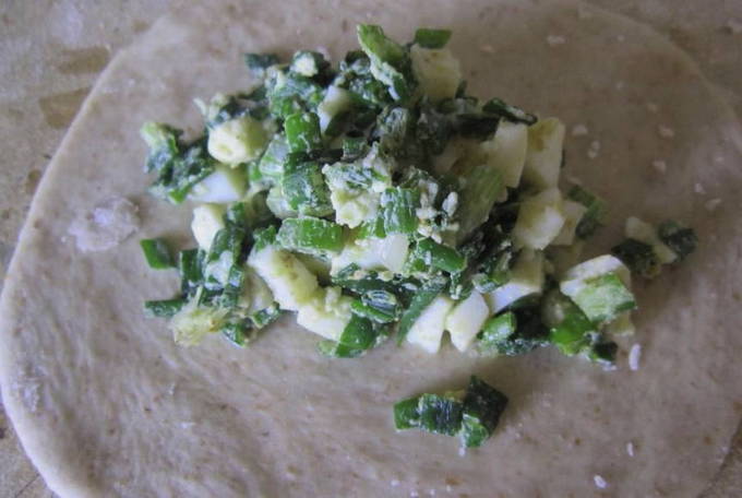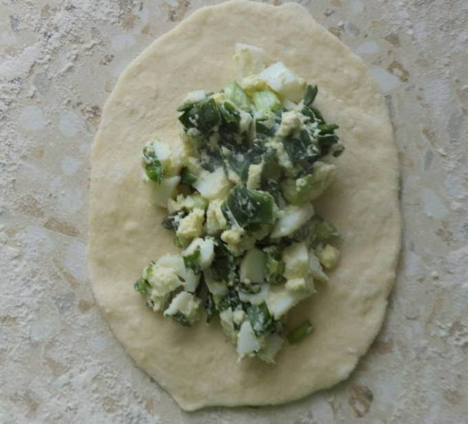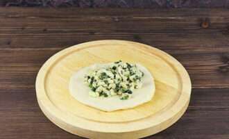 - Verdeel het afgewerkte deeg in stukken. We boetseren elk in een cirkel en vullen het met vulling.