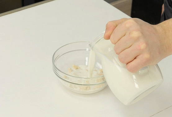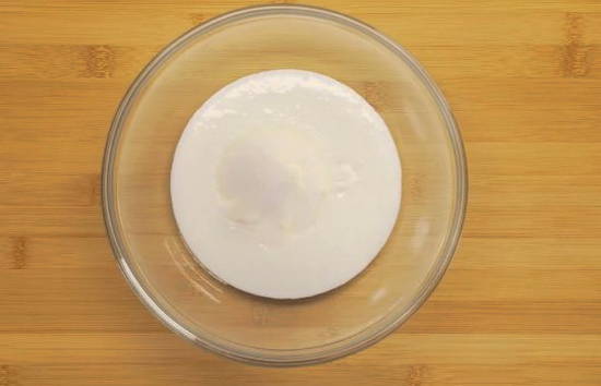 - Giet kefir in een diepe kom, verwarm het een beetje in de magnetron.