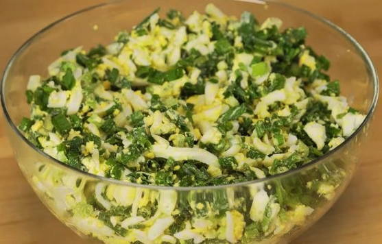- Laten we de vulling voorbereiden. Om dit te doen, moet je gekookte eieren mengen met gehakte groene uien.