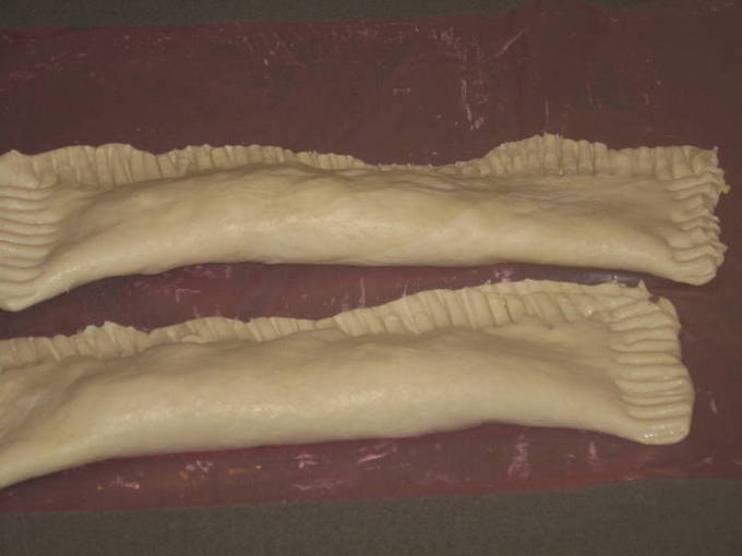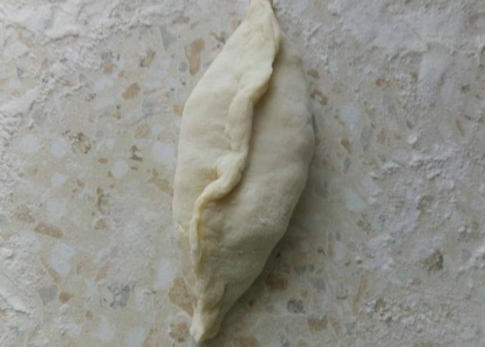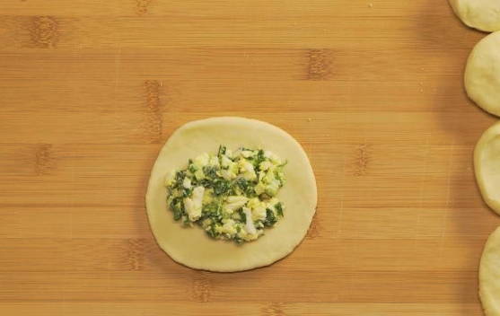 Verdeel het afgewerkte deeg in stukken, die we in cirkels kneden. Leg de vulling in het midden.