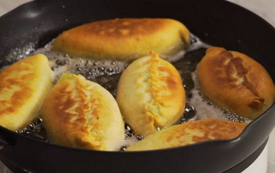 - Ruddy gebakken taarten met uien en eieren zijn klaar.